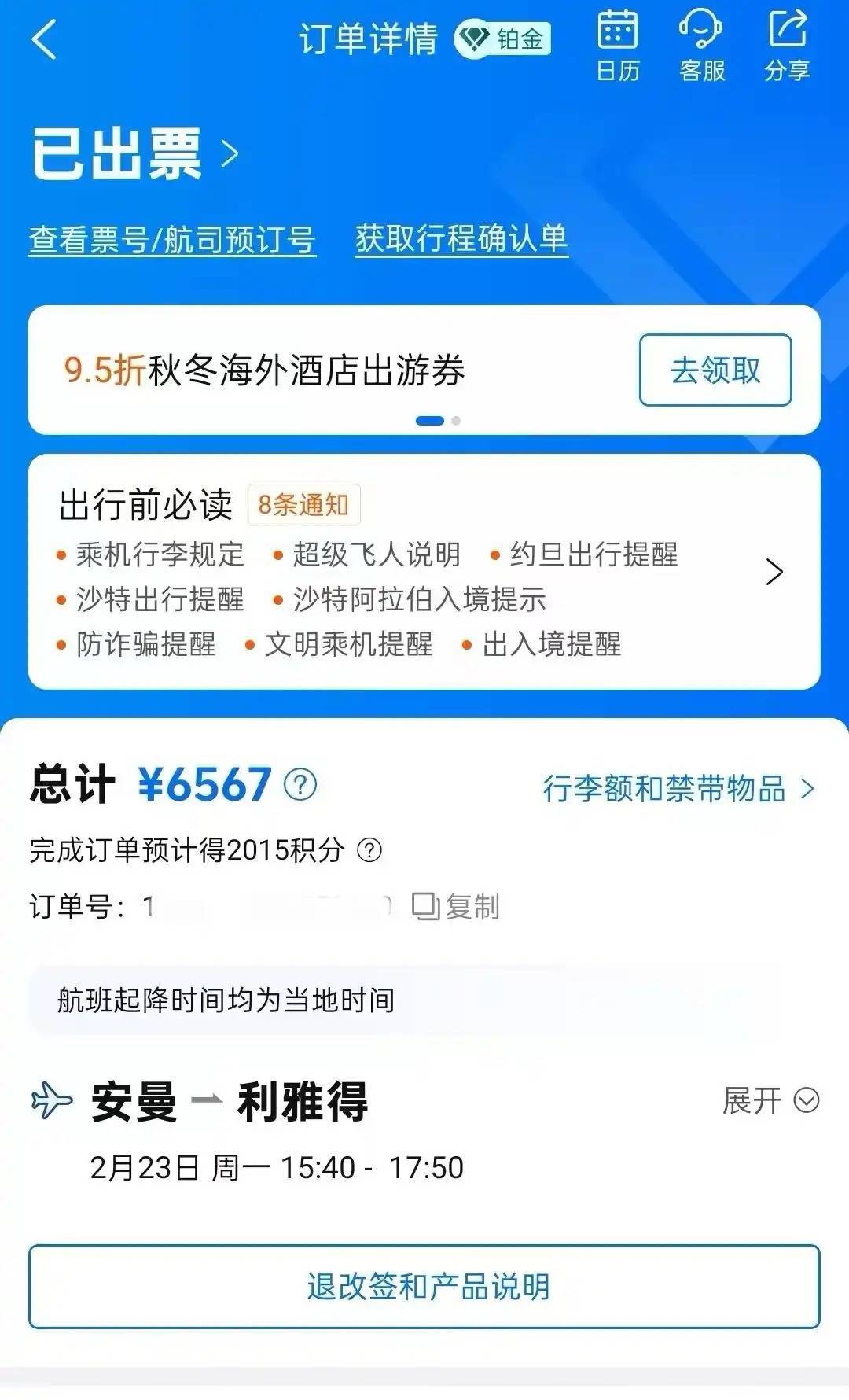 刘先生提前一个月就安排好了此次去约旦王人门安曼的旅游,回程的机票他是在携程App上购买的。根据订单闪现,刘先生要在2月23日下昼从安曼乘坐阿迪尔航空的F3542航班飞抵利雅得中转,然后不息东方航空MU270联程航班回上海。因是提前购票,返程机票只花了653元。